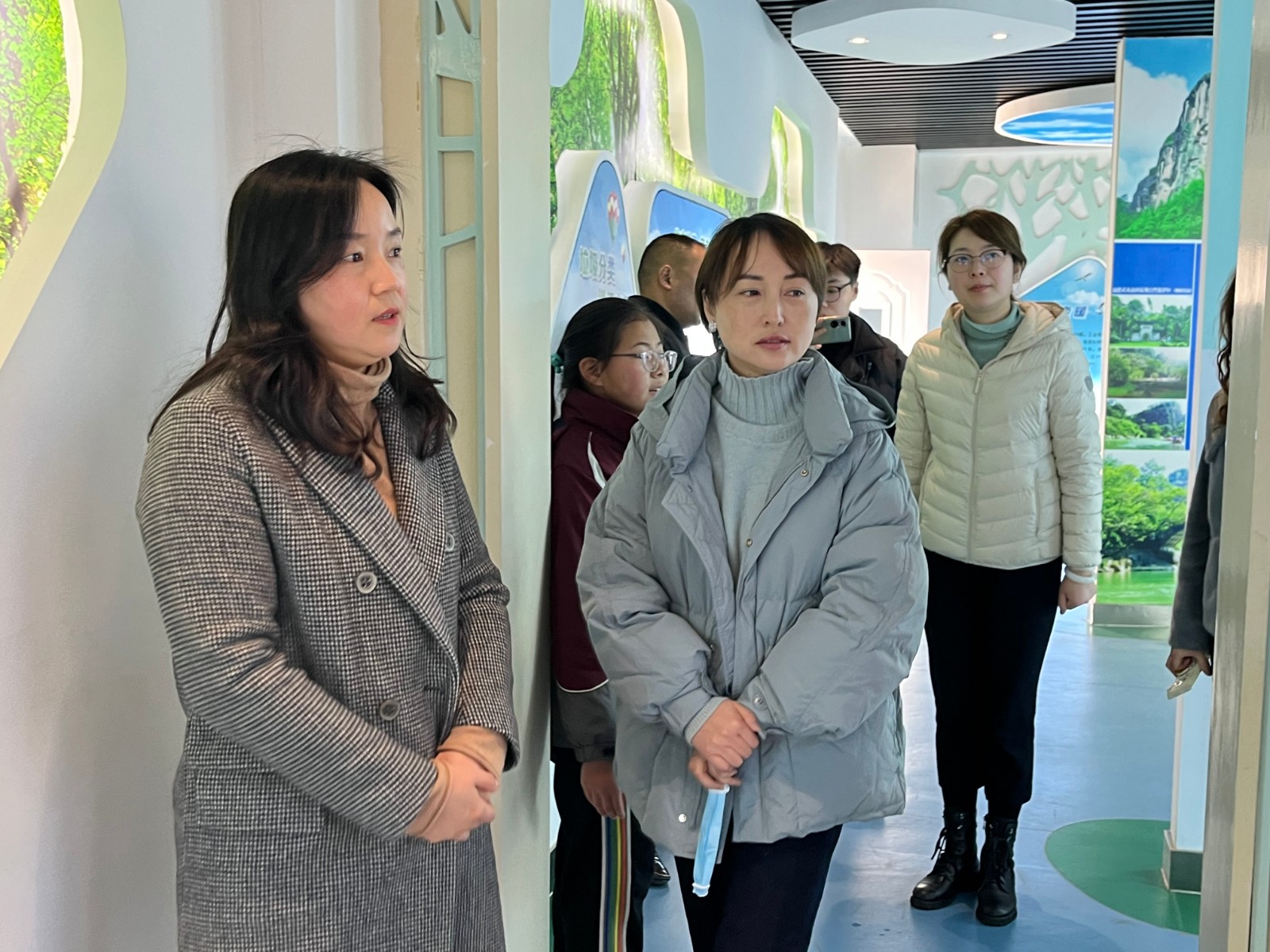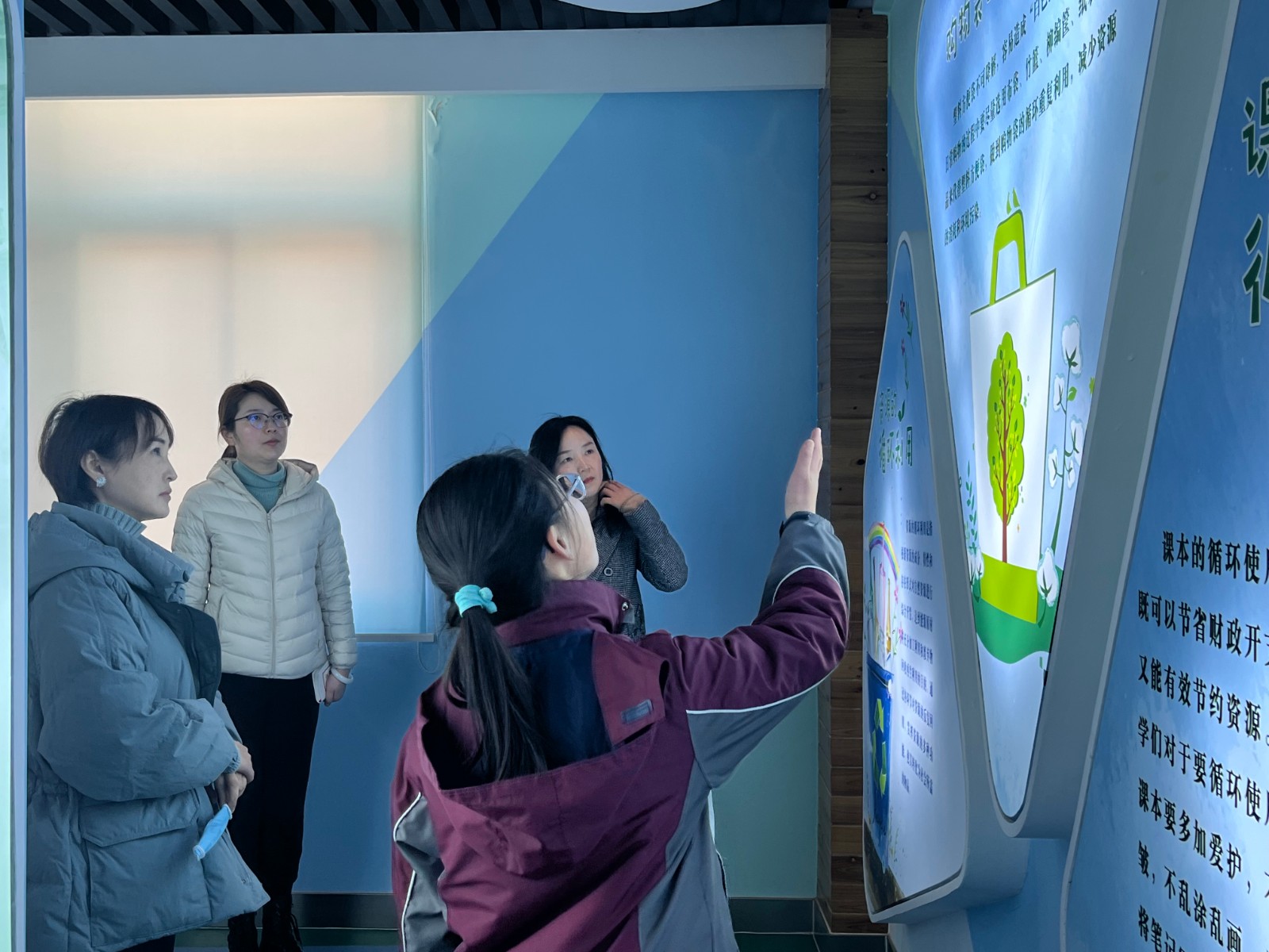 余秀萍校长热情接待了调研团队。在学校讲解宣传员的带领下,调研团顺着环保宣传墙参观了四楼的自然之声环保馆。