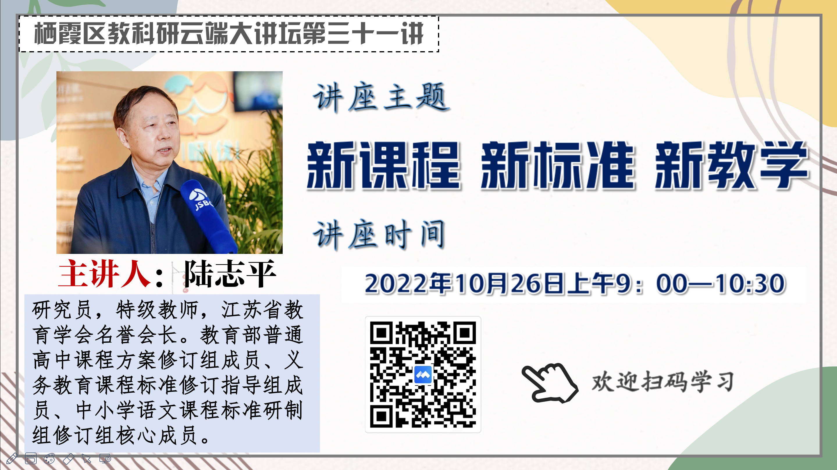 秋风万里动,日暮黄云高。2022年10月26日,南湾营小学全体教师通过腾讯会议聆听了栖霞教科研云端大讲坛第31讲,本讲的主题为《新课程 新标准 新教学》,由江苏省教育学会名誉会长、特级教师陆志平带来。