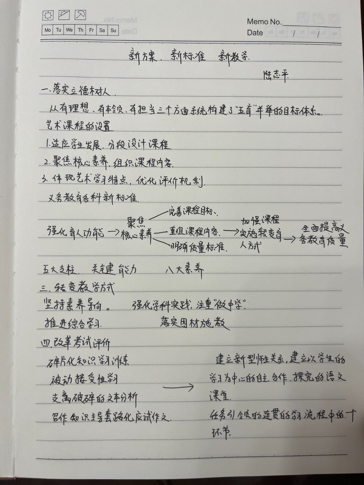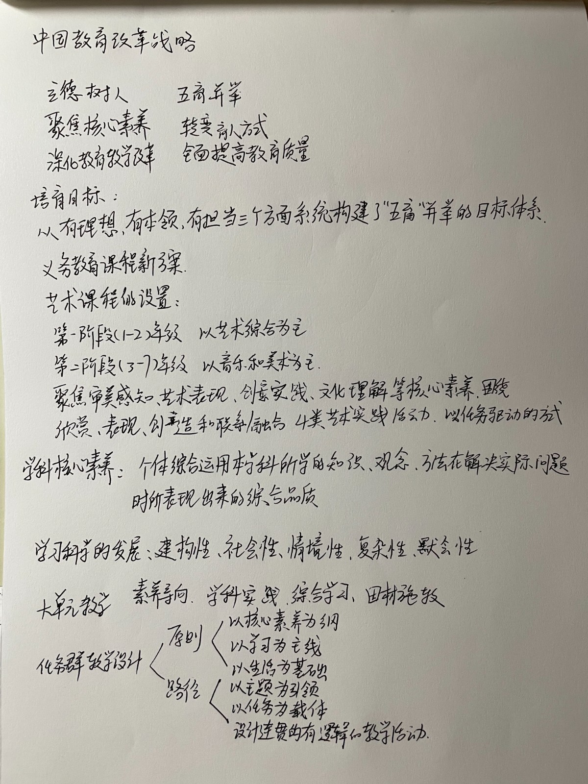首先是落实立德树人。陆老师提到2017版的《普通高中课程方案》和2022版的《义务教育课程标准》都是在党的十八大和十九大的精神指引下,为了落实立德树人的根本宗旨而修订的,同时陆老师还提到了现代学校制度的历史背景,然后结合课程方案中的信息科技课程、艺术课程、劳动课程具体阐述是如何通过五育并举来落实立德树人的。其次是聚焦核心素养。陆老师以语文课程、历史课程、地理课程、科学课程为例详细讲解了这些课程是如何体现核心素养的,聚焦核心素养需要完善课程目标、重组课程内容以及明确质量目标,要加强课程实施,转变育人方式,全面提高义务教育质量。第三点是转变教学方式。教学要坚持素养导向,强化学科实践,注重“做中学”,推进综合学习,还要落实因材施教,发挥新技术的优势。陆老师更是以生物课程、数学课程、英语课程、历史课程为例介绍任务群的设计原则和路径,之后通过义务教育阶段和高中阶段的语文单元详细讲解了如何重新设计课堂。最后是关于改革方式的评价,总体思路应从知识取向向素养导向转变。