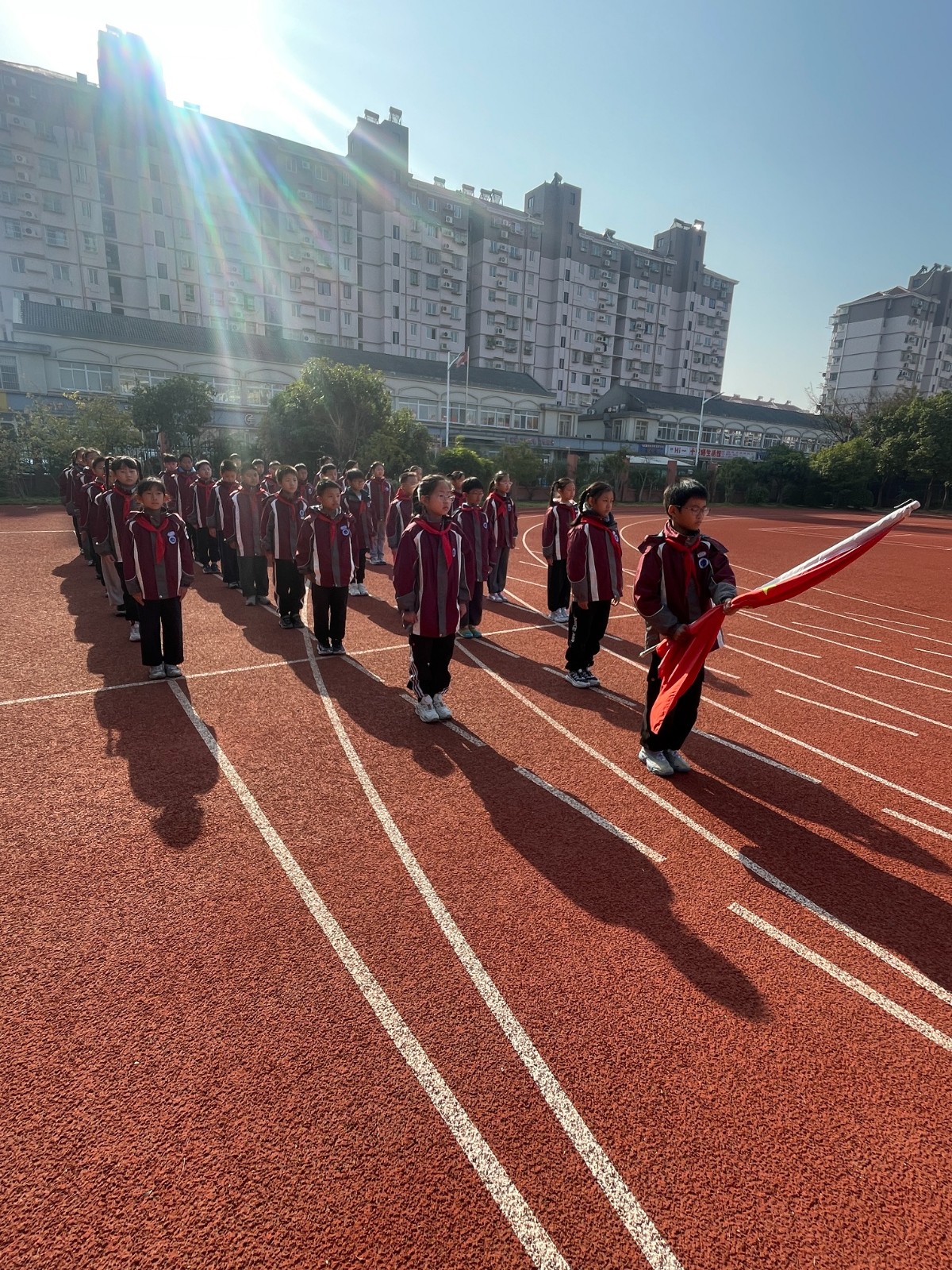 主持人和光荣的升旗手均来自四1班的同学。护旗手们精神饱满、步伐坚定,在全体师生的注视下,将国旗护送至旗杆下。“升国旗,奏唱国歌!”全体师生肃立,行注目礼,少先队员行队礼。伴随着激昂的《义勇军进行曲》,五星红旗冉冉升起,迎风飘扬。